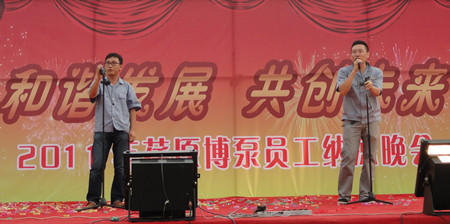 舞蹈《開門紅》寄托著荏原博泵員工對公司發(fā)展前景的美好期盼,展示了公司女職工的風(fēng)采。20多名復(fù)員軍人用一首《咱當(dāng)兵的人》抒發(fā)了他們保家衛(wèi)國、貢獻(xiàn)企業(yè)的豪情與壯志;研發(fā)部、技術(shù)部員工帶來的歌曲《跳起來》,展示了年輕人的青春與活力;質(zhì)量保證部員工在部長岳東海帶領(lǐng)下,演唱了歌曲《相親相愛一家人》,演繹著荏原博泵大家庭的親情、友情。友情樂隊(duì)帶來的動(dòng)感十足的歌曲,更是將晚會(huì)的氣氛烘托到高潮。